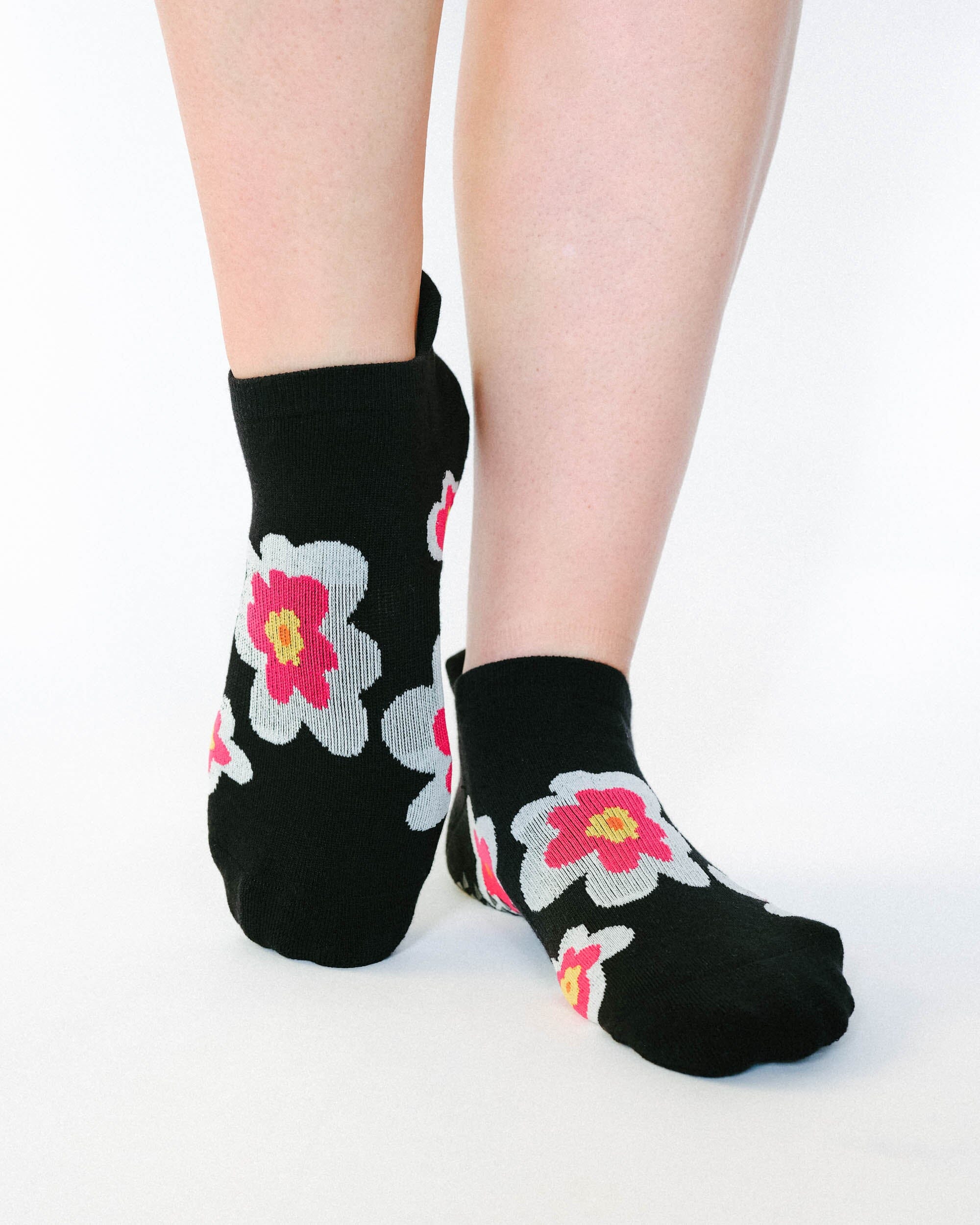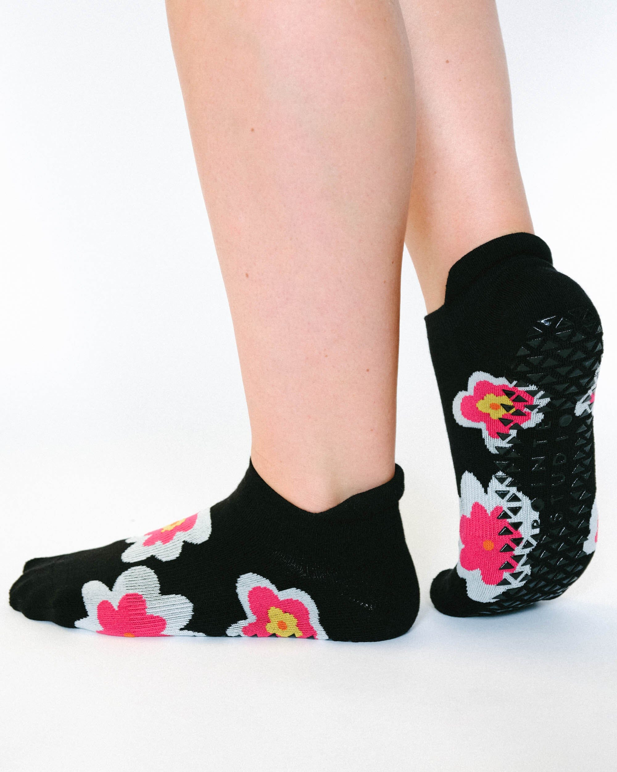 Put a little spring in your step with the Posy full foot. The large flower print will help inspire growth in your next studio work out. Featuring our no slip grip and compression arch support this style is a classic athletic look. A comfortable and flexible product designed for pilates, barre, and yoga but can enhance everyday life.