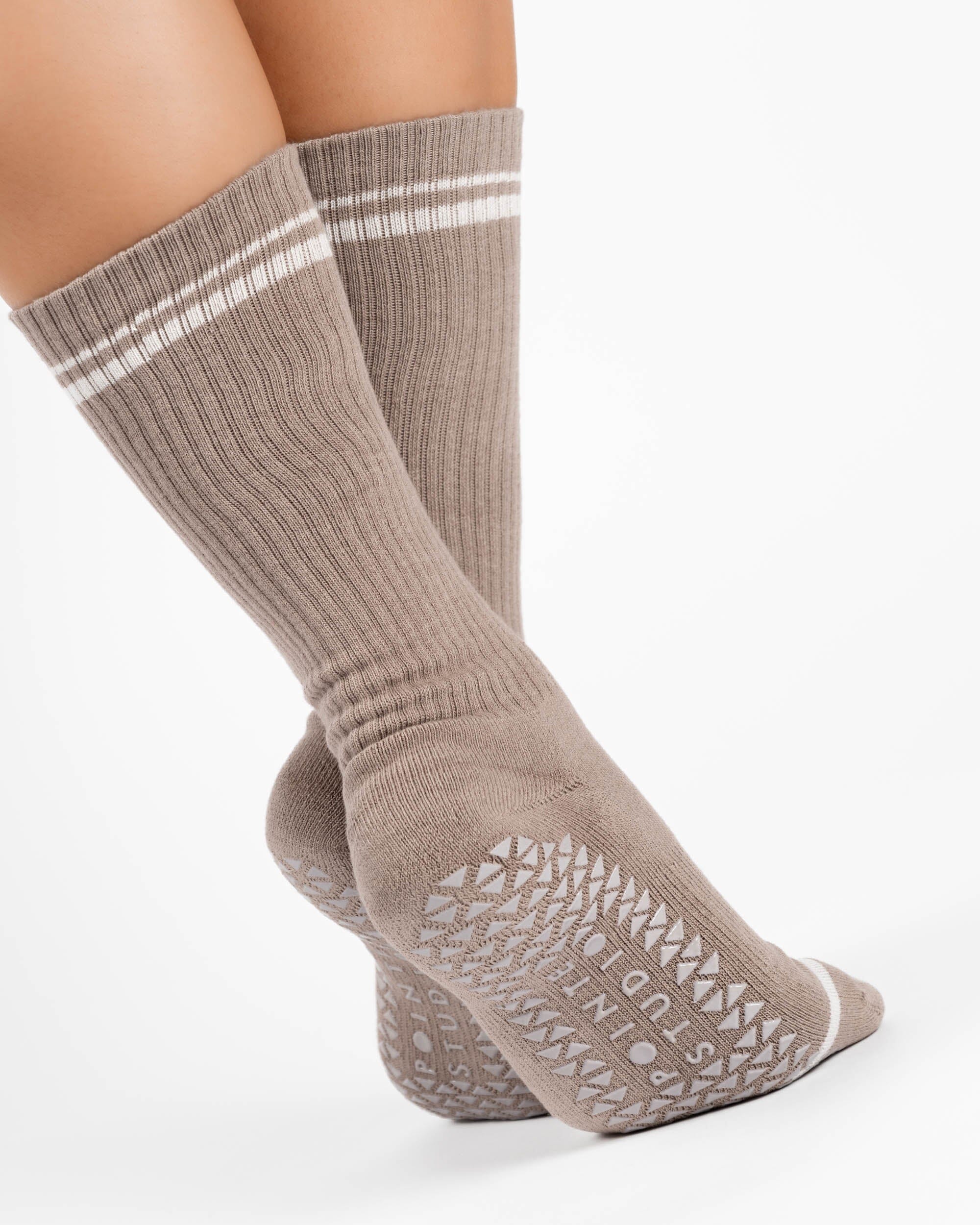 Add a little prep to your step in our Varsity crew. Featuring our no slip grip and compression arch support this style is a classic athletic look. A comfortable and flexible product designed for pilates, barre, and yoga but can enhance everyday life.