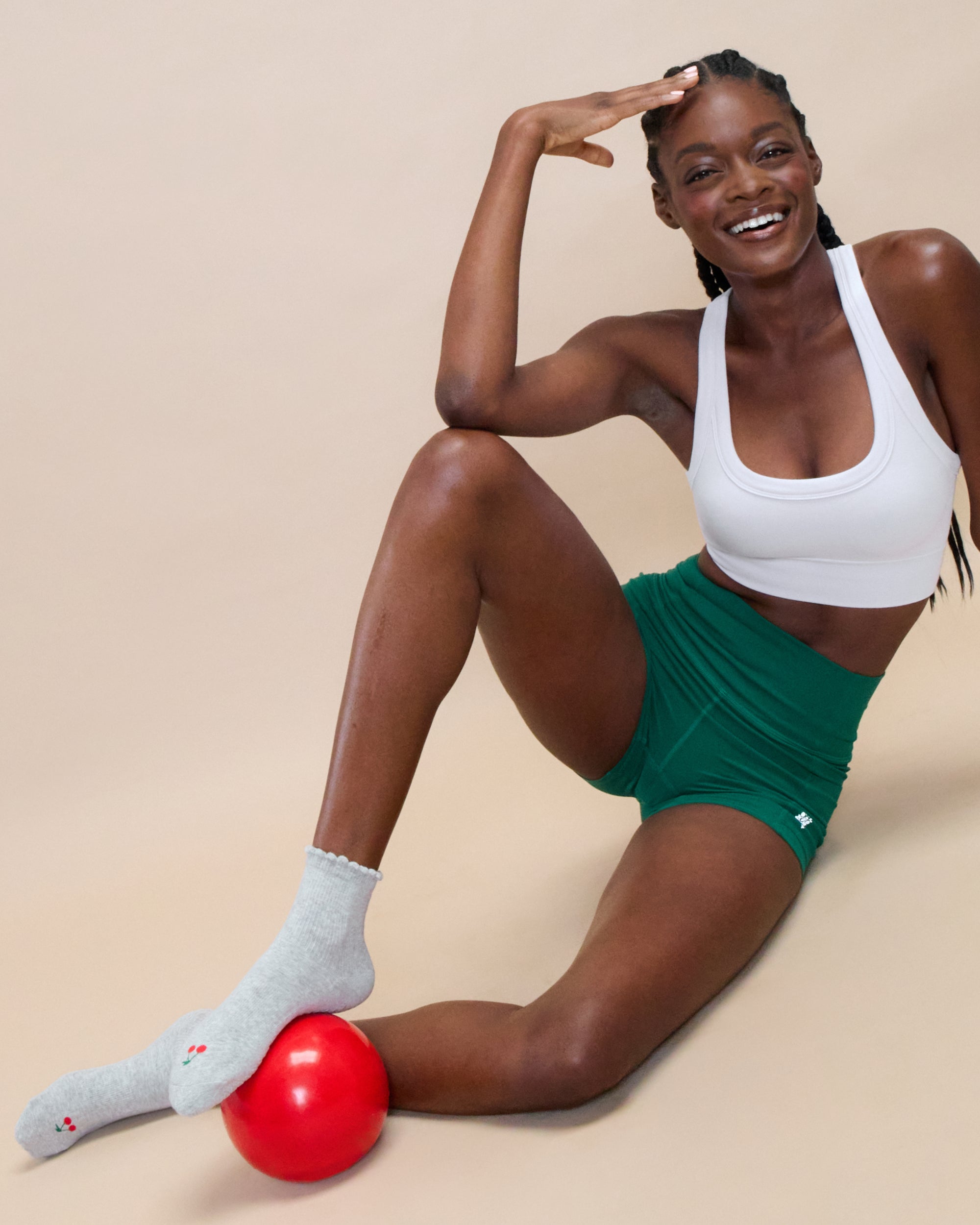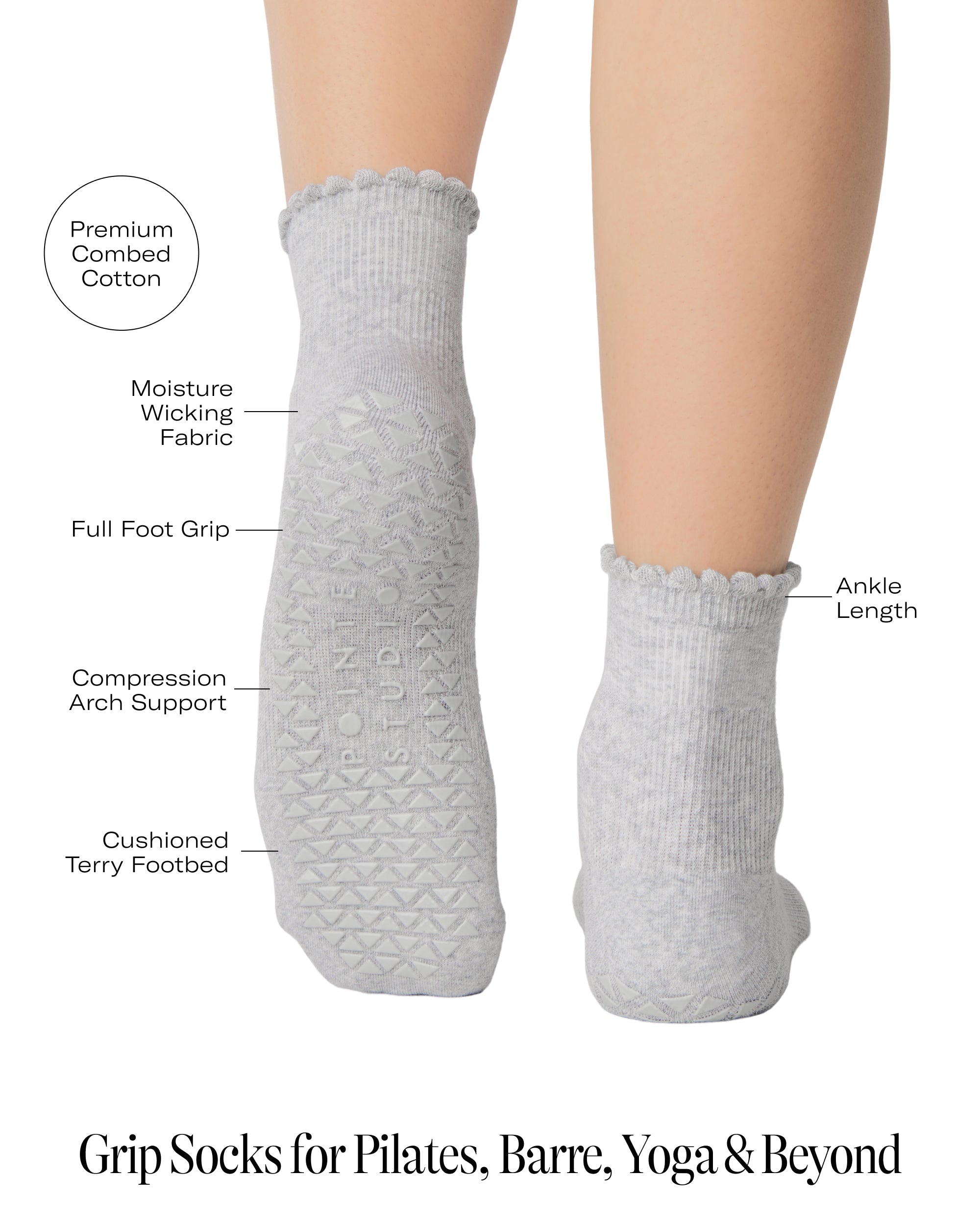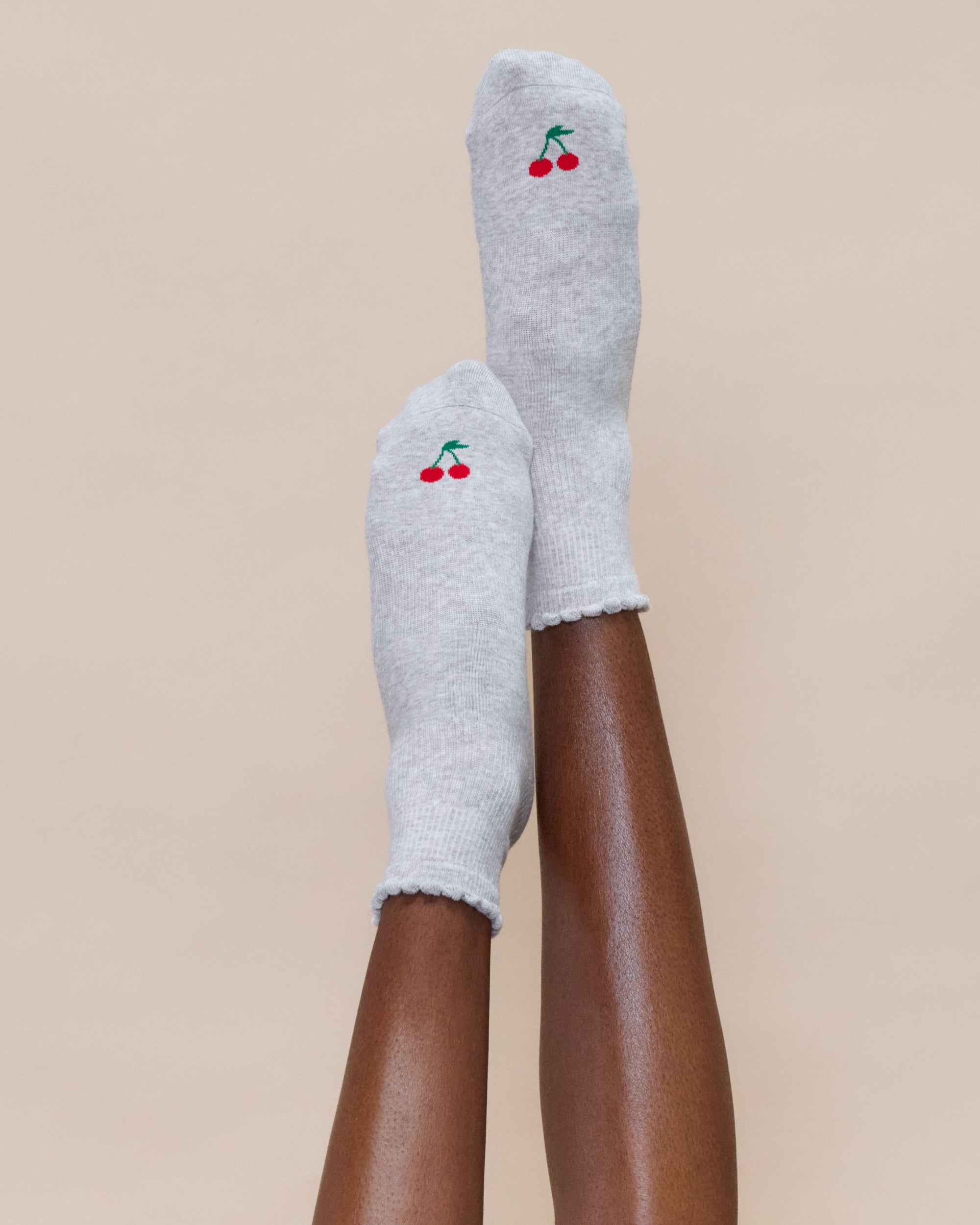 Top off your look with our Cherry Grip Ankle Socks—a solid design with a playful ruffle cuff and charming cherry motif. Move with confidence, backed by secure arch support, breathable cotton, and our signature extra-sticky grip to keep you balanced and focused with every step.