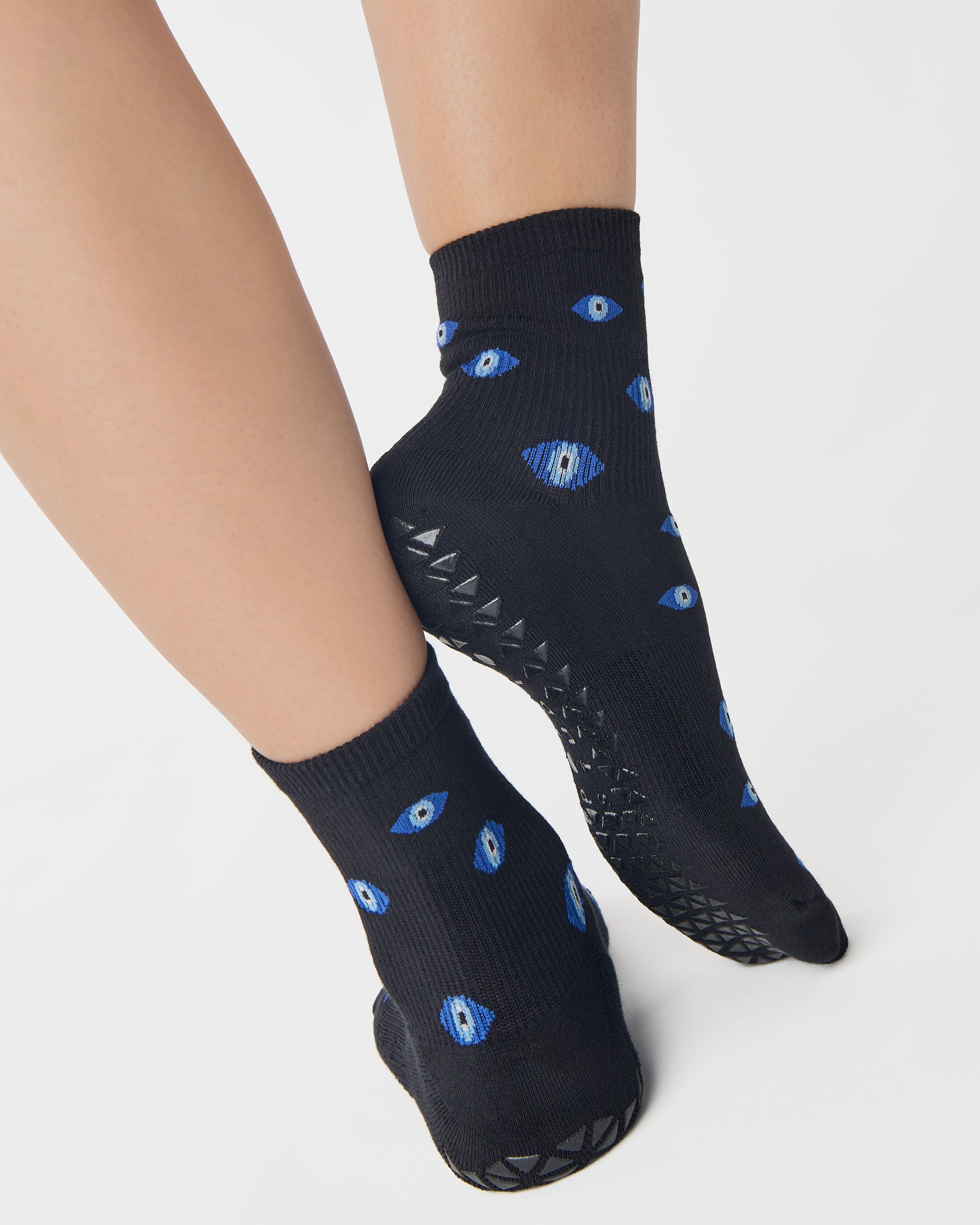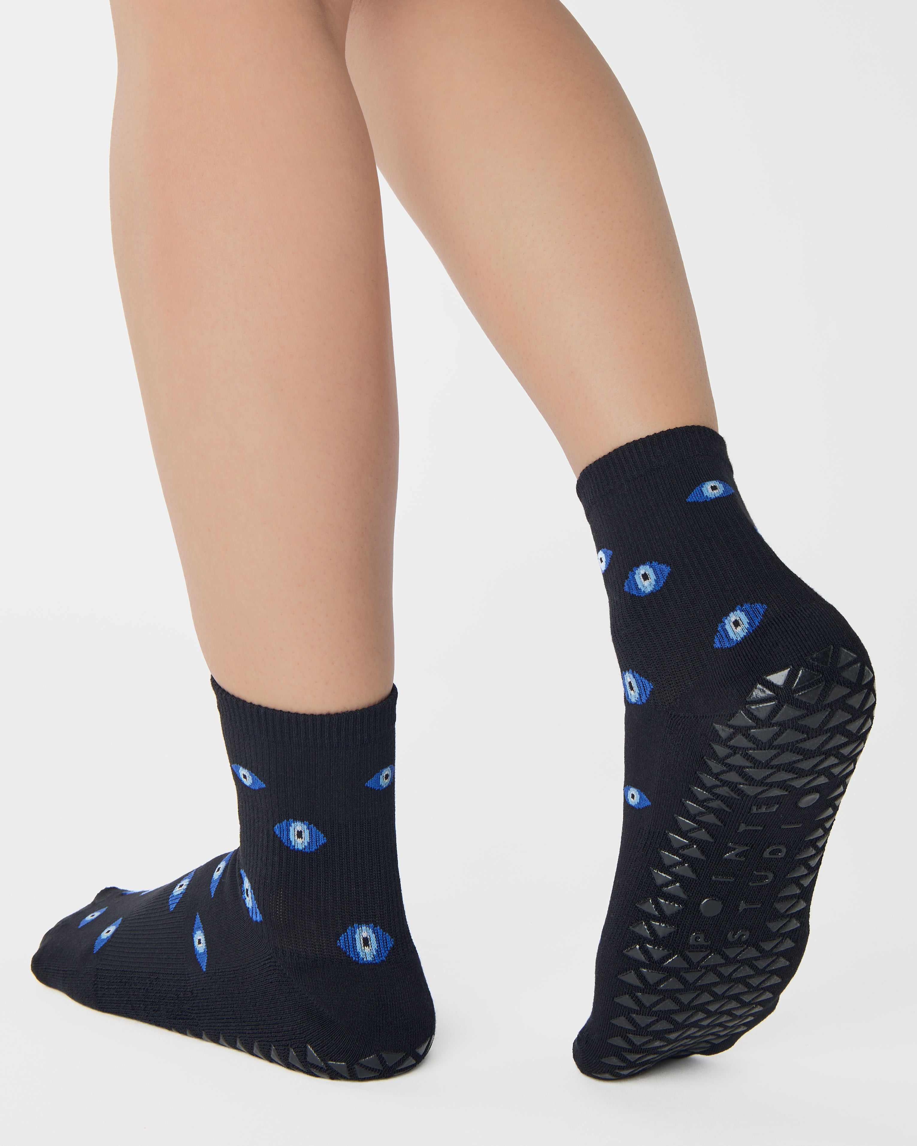 Channel protection through your practice with the Evil Eyes Ankle Sock. Featuring a subtle pattern of iconic evil eyes, this sleek black sock blends mindful intention with studio-ready performance. Designed with full-coverage no-slip grip and compression arch support, it delivers stability and comfort for Pilates, barre, yoga, and beyond. Crafted from breathable, moisture-wicking cotton, it keeps you grounded and centered—protecting your energy with every step.